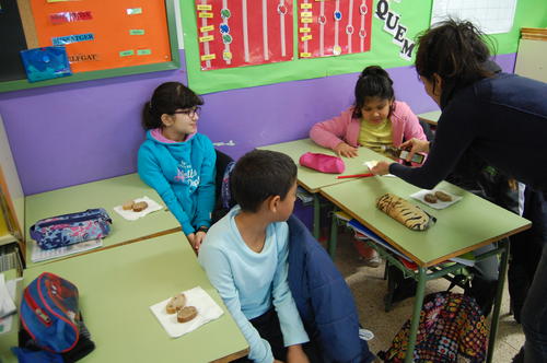 Per acabar, es prepara un esmorzar i es menja a classe. Cada alumne participa en l’elaboració del tast d’aliments a base de pa integral, oli d’oliva verge extra, formatge fresc, i fruita del temps. Es compren torrades especifiques pels alumnes celíacs i també es tenen en compte les al·lèrgies que provoquen algunes fruites.