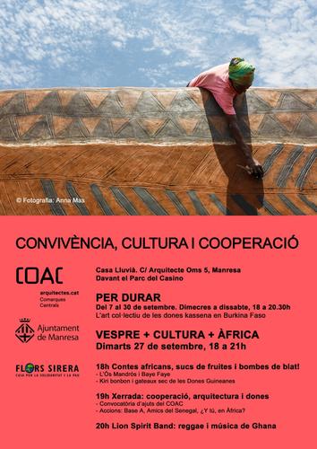 Manresa obre un espai per difondre l’acció social, l’arquitectura, la fotografia, la narrativa, la gastronomia i la música de diversos països i cultures subsaharianes. Diferents institucions i entitats de l’Àfrica Negra i de Manresa realitzen accions de difusió de la cooperació i la cultura aquest mes de setembre, a la Casa Lluvià de Manresa, al carrer Arquitecte Oms número 5, seu del Col·legi d’Arquitectes de Catalunya.