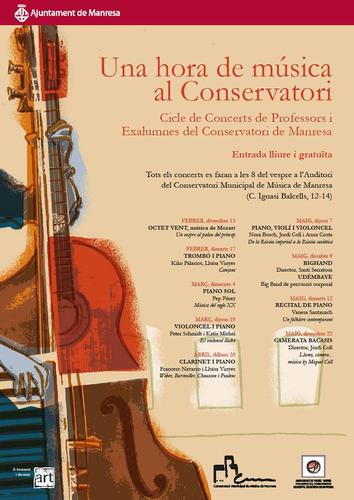 El Conservatori Municipal de Música de Manresa fa un nou pas endavant en l’organització del Cicle de Concerts de Professors i Exalumnes que, amb el nom “Una hora de música al Conservatori”, celebra enguany la seva cinquena edició, el que suposa la seva plena consolidació en el calendari cultural de la ciutat d’una proposta musical que tindrà lloc a l’Auditori del 13 de febrer al 22 de maig.