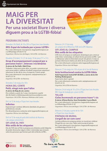Entre les activitats programades destaca un espai LGTBI+ per a joves, un grup d’acompanyament per a persones trans*, intersex i no binàries, accions de sensibilització a joves d’instituts i universitats de Manresa i una sessió de contes a la Biblioteca Infantil.