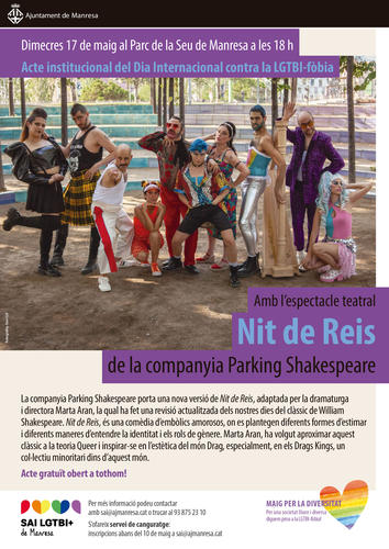 El Dia Internacional contra la LGTBI-fòbia, que se celebra demà dimecres, començarà al matí amb la penjada de la bandera irisada a la façana de l’Ajuntament de Manresa. A mitja tarda, al Parc de la Seu de Manresa, se celebrarà l’acte institucional de la jornada amb l’obra de teatre “Nit de Reis” a càrrec de la companyia Parking Shakespeare.