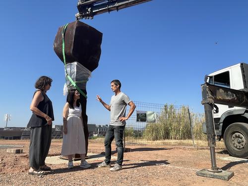 (**) Peu de foto: La regidora Tània Infante (al mig) amb Oduber i Sellarès, durant la presentació del festival, amb l'escultura al darrera