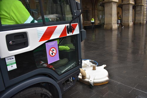 (*) Peu de foto: Màquina netejant la plaça Major amb aigua no potable regenerada