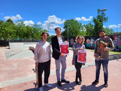 (*) Peu de foto: Samuel della Siega, responsable de la Comissió Tècnica d'skateboarding de la Federació Catalana de Patinatge; el regidor d’Esports, Anjo Valentí Moll; la regidora de Joventut, Isabel Sánchez Pulido; i el president de l’Associació Stalow, Ferran Soler Cot