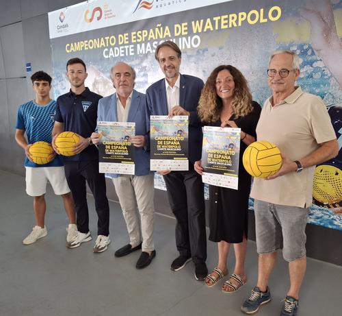 (*) Peu de foto: Avui s'ha presentat a les Piscines Municipals, el Campionat d'Espanya de Waterpolo cadet masculí. D'esquerra a dreta. Aarón Luján Pérez (capità de l'equip cadet); David Torilo Romero (entrenador); Pere Robert Font (directiu de la FCN); Anjo Valentí Moll (regidor d'Esports); Montse Gomáriz González (presidenta CN Manresa) i Gaspar Ventura Meseguer (exesportita olímpic).