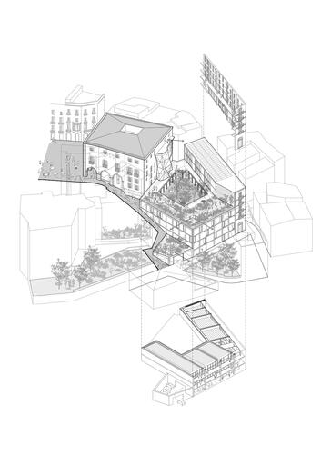 L’edifici estarà condicionat a la topografia complexa, als carrers en pendent, a les façanes protegides del carrer Vallfonollosa i a la roca del subsòl. L’estudi d’arquitectura ha previst reomplir amb terra la part central de l’equipament on s’ubicarà el jardí, tot conformant una torreta on es plantaran arbres i vegetació. D’aquesta manera, Manresa comptarà amb un nou espai verd urbà al qual es podrà accedir des de l’edifici, des de la Baixada dels Jueus i des del carrer del Bisbe. La proposta presentada preveu també la restauració i consolidació de les façanes del carrer Vallfonollosa.
