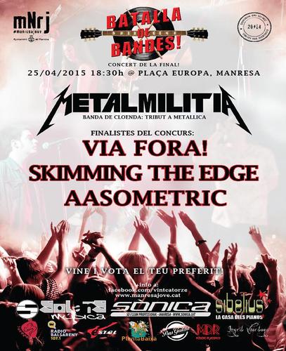La Plaça Europa de Manresa acollirà aquest dissabte la gran final del concurs Batalla de Bandes. Els grups Via Fora, Skimming the edge i AAsometric es disputaran en primer en lloc a pa rtir de dos quarts de set de la tarda. La final consisteix en l’actuació en directe dels tres grups i també l’actuació del grup Metalmilita que fa un Tribut a Metàlica. Els guanyadors els decidirà un jurat integrat per gent del món musical i amb una llarga trajectòria dins l’àmbit.