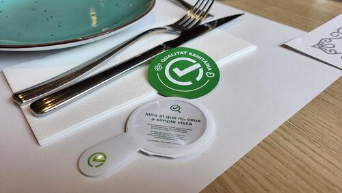 (*) Peu de foto: lupa explicativa a la taula d'un restaurant amb Segell QS.