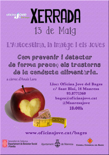 L’Oficina Jove del Bages organitza pel dimecres, 13 de maig, la xerrada “L’autoestima, la imatge i els joves”, que farà Anaïs Lara. En la xerrada es parlarà sobre com prevenir i detectar precoçment els trastorns de la conducta alimentària.