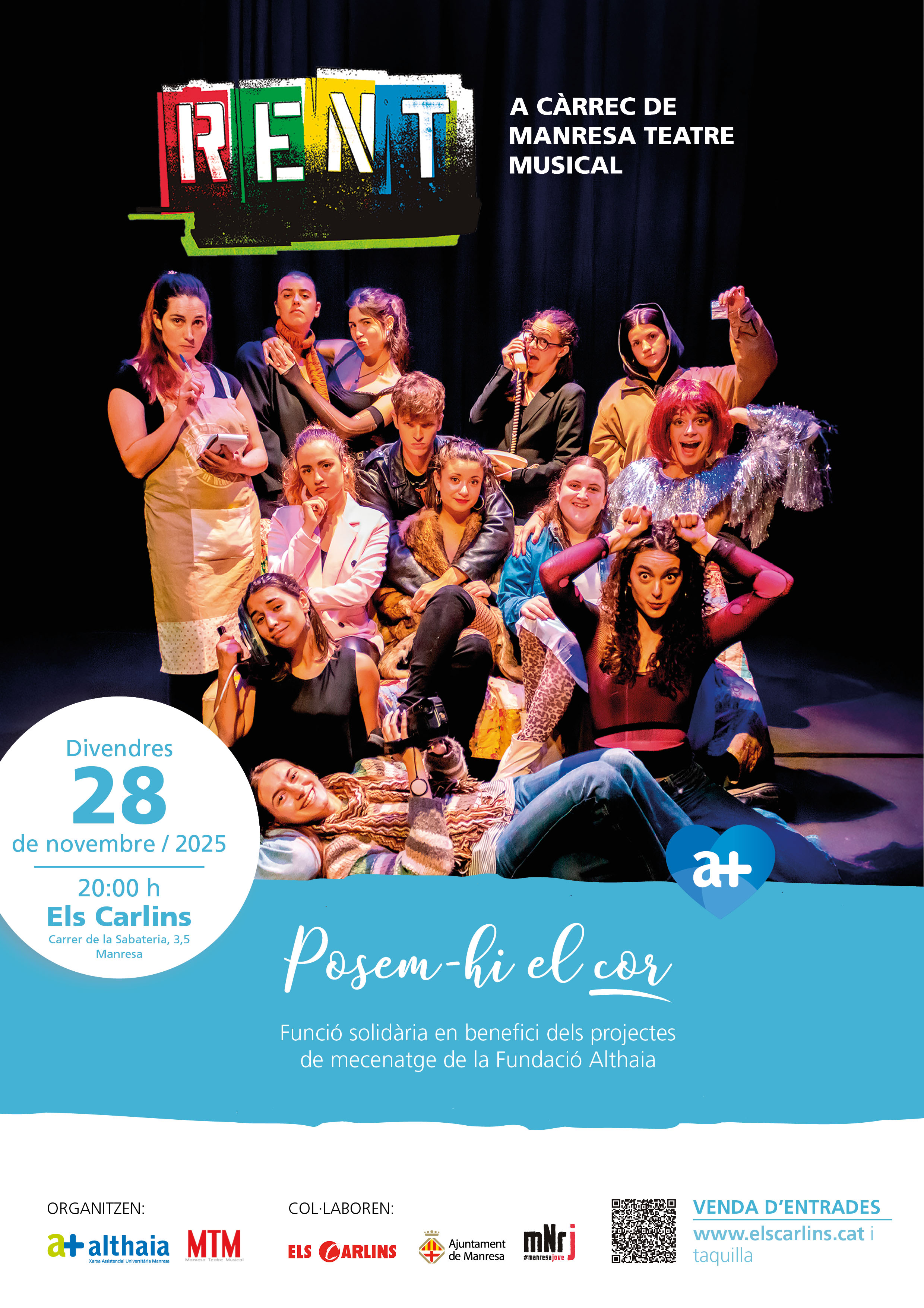 En col·laboració del Programa de Joventut de l’Ajuntament de Manresa es realitzaran tallers als patis dels centres d’educació secundària de Manresa per treballar la prevenció i l’estigma associats al VIH i les infeccions de transmissió sexual. Manresa Teatre Musical (MTM) oferirà una funció solidària del musical ‘Rent’ el divendres 28 de novembre al teatre Els Carlins. Les entrades ja estan a la venda.