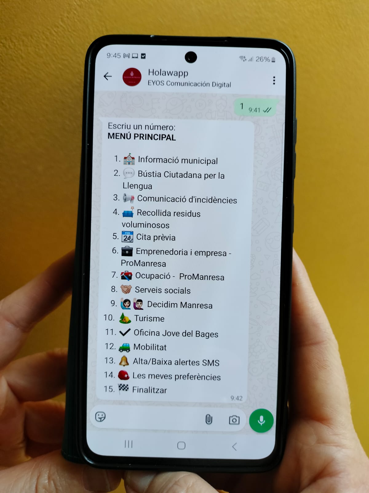 Holawapp forma part de les accions per millorar l’administració electrònica i posar a disposició de la ciutadania eines àgils, simples i segures per interactuar amb l’Ajuntament. Per accedir-hi, només cal guardar el número 644 069 801 a l’agenda de contactes del dispositiu mòbil i enviar un WhatsApp posant la paraula “hola”. També s’hi pot accedir a través de l’enllaç aju.cat/Manresa.