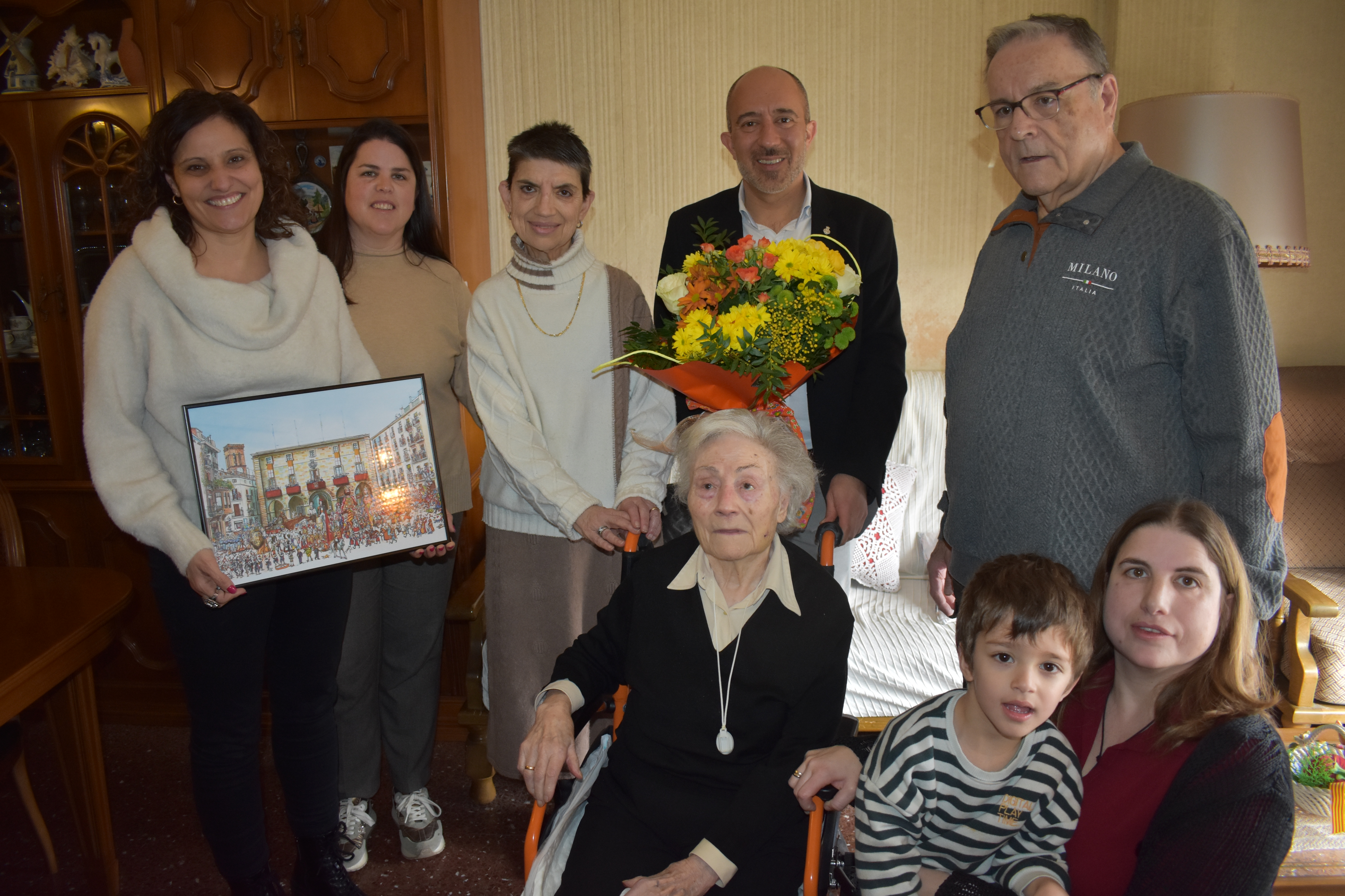(*) Peu de foto: l'alcalde i la regidora han lliurat un ram i un obsequi a l'homenatjada