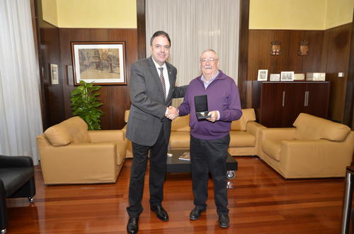 L’alcalde de Manresa, Valentí Junyent, ha rebut al seu despatx el tècnic municipal de Protecció Civil, Xavier Jovés, que aquest dilluns ha estat reconegut amb la Medalla de Bronze al mèrit policial amb distintiu blau durant la celebració del Dia de les Esquadres, en un acte que va ser presidit per primer cop pel president de la Generalitat, Artur Mas.