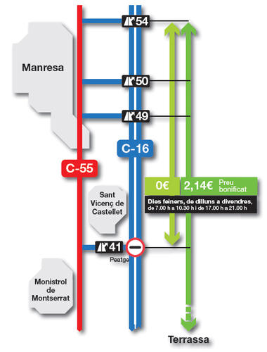 - Barrera troncal: descompte del 50% per als vehicles que entrin o surtin dela C-16 pels enllaços 49 (Manresa Sud), 50 (Manresa Centre) i 54 (Sant Fruitós de Bages), en tots dos sentits de la circulació.