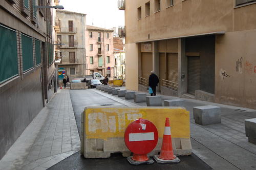 Per limitar l’ocupació de l’espai per part dels vehicles, i restringir-lo només a l’espai de pas, s’utilitzen dues solucions: desnivell en el paviment i col·locació de daus de pedra. L’ordenació plantejada farà evident, ja des de l’accés per la plaça Infants, que s’entra en un espai de prioritat per a vianants (per la presència d’un gual i pel canvi de material de pavimentació).