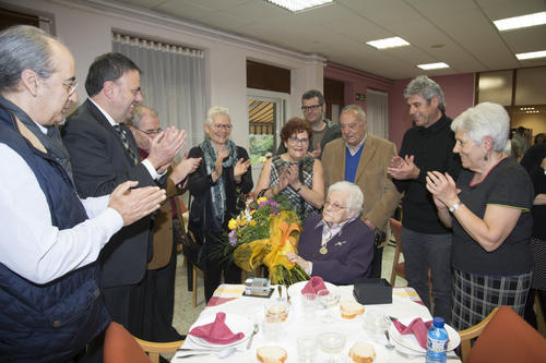 L’alcalde Valentí Junyent li va lliurar un obsequi i un ram de flors per celebrar el seu centenari.
