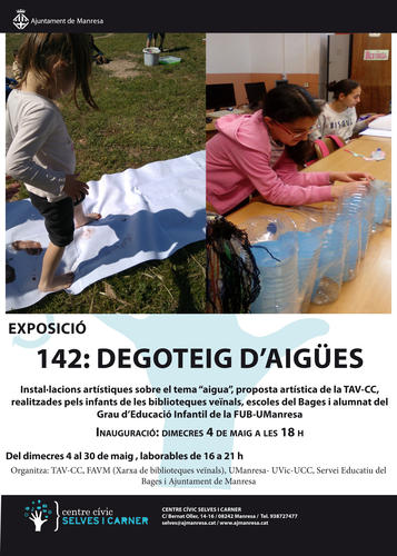 Demà dimecres, 4 de maig, a les 6 de la tarda, s’inaugura al Centre Cívic Selves i Carner (C/ Bernat Oller, 14-16) l’exposició “142: Degoteig d’aigües”. La mostra forma part del projecte pedagògic “Art Mestres i Creació” (AMiC), està coordinada i comissariada per la Taula de les Arts Visuals de la Catalunya Central (TAV-CC) i acompanya l’exposició “Som Aigua” de l’Espai7 del Centre Cultural el Casino de Manresa.
