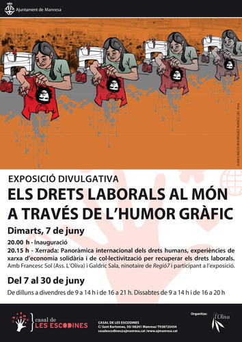 Demà dimarts, 7 de juny, a les 8 del vespre, s'inaugura al Casal de les Escodines l'exposició “Els drets laborals al món a través de l'humor gràfic”, una selecció d'una trentena d'obres rebudes al "Primer Concurs Internacional d'Humor Gràfic sobre Drets Laborals” entre el 9 de juny i el 31 d'agost de 2015, que va ser coorganitzat per l’Associació l’Oliva i per CGT Catalunya.
