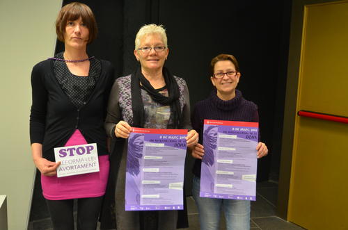 Mila López duia un adhesiu amb el lema “STOP Reforma Llei Avortament” i ha anunciat que aquesta reivindicació contra la llei tramitada pel govern del Partit Popular a Madrid hi serà a tots els actes de la programació del Dia Internacional.