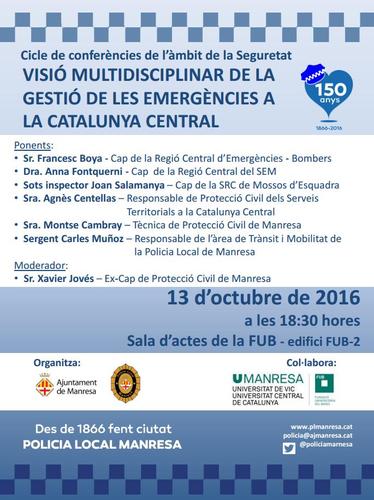 L’acte tindrà lloc ala Salad’actes dela FUB– edifici FUB-2- a dos quarts de 7 de la tarda i és obert a tothom. Els ponents que participaran en aquesta conferència són Francesc Boya, cap de Bombers de la Regió Central d’Emergències; la doctora Anna Fontquerni, cap de la Regió Central del SEM; el sots inspector Joan Salamanya, cap de la SRC de Mossos d’Esquadra; Agnès Centellas, responsable de Protecció Civil dels Serveis Territorials de la Catalunya Central; Montse Cambray, tècnica de Protecció Civil de l’Ajuntament de Manresa; i el sergent Carles Muñoz, responsable de l’àrea de Trànsit i Mobilitat de la Policia Local de Manresa.