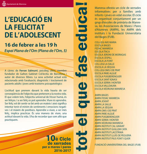 El cicle de xerrades per a pares i mares, adreçat a famílies amb infants i joves en edat escolar, està organitzat conjuntament per un grup d'escoles de Primària de Manresa, l'Associació de Mares i Pares d'Alumnes (AMPA), les AMPA dels instituts, la Fundació Universitària del Bages (FUB) i l'Ajuntament de Manresa.
