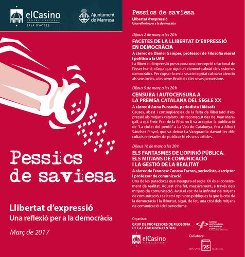 El cicle Pessics de Saviesa, que durant aquest de març han pivotat sobre l’eix temàtic genèric Llibertat d’expressió. Una reflexió per a la democràcia, té com a objectiu principal la divulgació del pensament i el coneixement filosòfic i està organitzat per l’Ajuntament de Manresa (Centre Cultural el Casino), el Grup de Professors de Filosofia de la Catalunya Central i, en aquest cicle concret, dedicat a la llibertat d’expressió, s’ha comptat amb la Demarcació de la Catalunya Central del Col·legi de Periodistes de Catalunya. També hi col·labora Llibres Parcir.