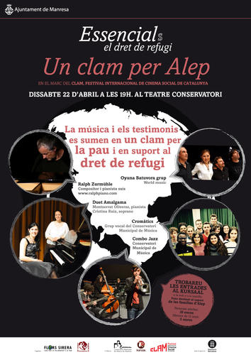 Manresa no vol acostumar-se al drama de la guerra, per aquest motiu el Pla de sensibilització proposa un concert de suport a la ciutat d’Alep que tindrà lloc el dissabte, 22 d’abril a les 19 h, al Teatre Conservatori en el marc dels actes que té programats el Clam, el Festival Internacional de Cinema Social de Catalunya.