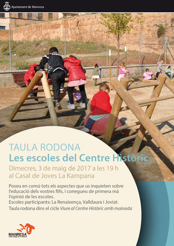 L’Ajuntament de Manresa ha organitzat per al proper dimecres, 3 de maig, una taula rodona titulada “Les escoles del Centre Històric”, una iniciativa que forma part del cicle “Viure al Centre Històric amb mainada” que impulsa el Comissionat del Centre Històric de Manresa.