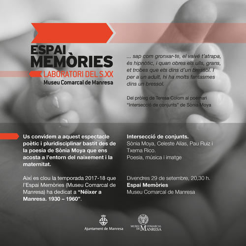 Demà, divendres 29 de setembre, a 2/4 de 9 del vespre, tindrà lloc al Museu Comarcal l’espectacle poètic i pluridisciplinari “Intersecció de Conjunts” que clourà la temporada 2017-18 que l’Espai Memòries (Museu Comarcal) ha dedicat a “Néixer a Manresa. 1930 – 1960”.