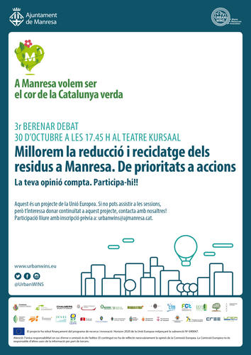 Emmarcat del projecte europeu UrbanWINS, el teatre Kursaal acollirà, a partir de les 17.45 h de la tarda, la tercera sessió per debatre sobre com millorar la reducció dels residus a la ciutat, així com la seva correcta gestió. La sessió és gratuïta, però cal inscripció prèvia a l'adreça urbanwins@ajmanresa.cat