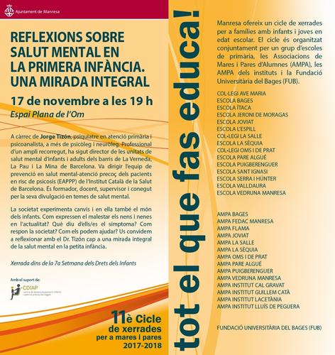 El cicle de xerrades per a pares i mares, adreçat a famílies amb infants i joves en edat escolar, està organitzat conjuntament per un grup d'escoles de Primària de Manresa, l'Associació de Mares i Pares d'Alumnes (AMPA), les AMPA dels instituts, la Fundació Universitària del Bages (FUB) i l'Ajuntament de Manresa.