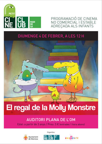 La primera projecció serà El regal de la Molly Monstre, aquest diumenge 4 de febrer a l’Auditori de la Plana de l’Om, una pel·lícula molt colorista recomanada per a infants a partir de 3 anys.
