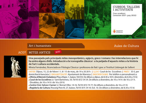 L’Aula deCultura“Mites antics”, que ofereix una passejada pels principals mites mesopotàmics, egipcis, grecs i romans i les interrelacions que hi havia entre alguns d’ells. Introducció a la iconografia clàssica, a la petjada d’aquests mites a la història de l’art i cultura occidentals.