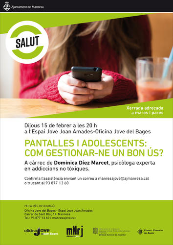Demà, dijous 15 de Febrer a les 8 del vespre, l’Oficina Jove del Bages (C/ Sant Blai 14) oferirà a pares i mares una xerrada que parlarà sobre Pantalles i adolescents: com gestionar-ne un bon ús? , que anirà a càrrec de Dominica Díez Marcet, psicòloga clínica de la Unitat de Joc Patològic i Altres Addiccions no Tòxiques d’Althaia.