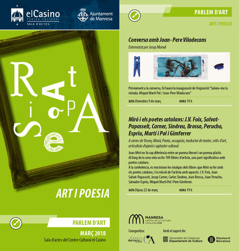 Les dues activitats programades es duran a terme a la Sala d’Actes del Casino a les 7 de la tarda. La primera, aquest divendres 9 de març, es tracta d’una entrevista que Josep Morral farà a l’artista Pere Joan Viladecans prèviament a l’exposició Salveu-me la mirada. La segona activitat, que tindrà lloc el dijous 22 de març, serà una xerrada sobre Miró i els poetes catalans, a càrrec de Vicenç Altaió.