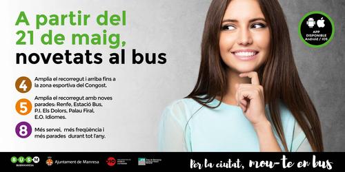 Dilluns vinent, 21 de maig, Bus Manresa posarà en marxa un paquet de novetats amb l’objectiu de continuar millorant el servei de bus a la ciutat, i ho farà amb l’estrena de nous itineraris i noves parades per tal que la ciutadania pugui desplaçar-se en transport públic a indrets on fins ara no es podia arribar. Aquestes novetats afecten a les línies 4 (Font-Valldaura), 5 (Sant Pau-Viladordis) i 8 (Perimetral).