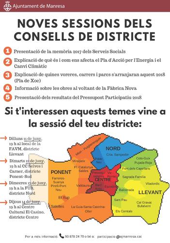 L’Ajuntament de Manresa ha convocat per al proper mes de juny els plenaris dels Consells de Districte de la ciutat (Centre, Llevant, Nord i Ponent) i convida tothom a participar-hi. El Consell de Districte és l'òrgan de deliberació i representació del districte on es tracten els assumptes que afecten al territori i s'analitzen i coordinen les actuacions que s'hi desenvolupen.