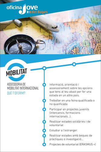 L’Oficina jove del Bages disposa d’un servei d’assessorament personalitzat en mobilitat internacional per a persones joves, que ofereix informació i suport alhora d’escollir la millor opció per a fer una estada a l’estranger.