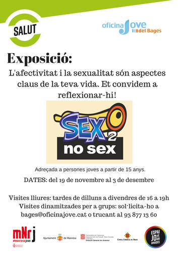 L’Oficina Jove del Bages (c. Sant Blai, 14) organitza l’exposició “Sex o No Sex2” a l’Espai Jove Joan Amades per treballar temes de sexualitat i afectivitat amb les persones joves. La mostra, que es podrà veure del 19 de novembre al 3 de desembre, estarà oberta a tot el públic jove. Així l’horari de visita de forma lliure serà de dilluns a divendres de16 a19 h.