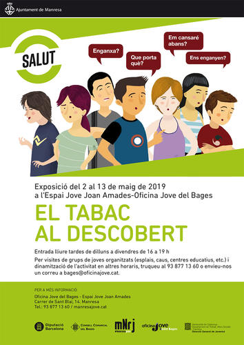 L’Oficina Jove del Bages (c. Sant Blai, 14) acollirà del 2 al 13 de maig l’exposició “El tabac al descobert”, adreçada a un públic jove per tal de brindar-los informació i estímuls i generar actituds contràries al tabac i al seu consum, i refermar, en les persones que no hagin fumat mai, la seva posició per tal d’evitar (o si més no retardar) l’experimentació amb el tabac.