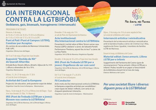 Des del SAI LGTBI de Manresa en coordinació amb diferents àrees de l’Ajuntament s’aposta clarament per la visibilització i sensibilització de la diversitat afectiva sexual i de gènere, per la qual cosa s’han programat tot un seguit d’activitats que tindran lloc al llarg d’aquest mes.