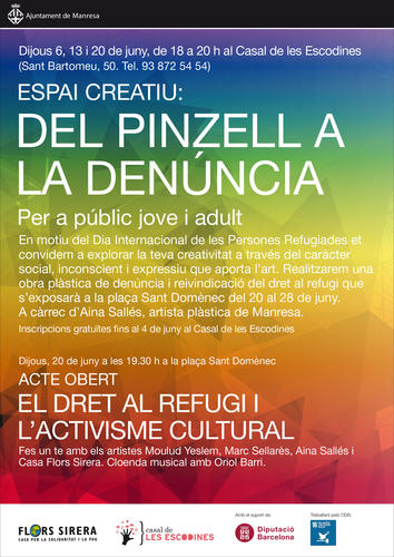 Aquesta obra plàstica de denúncia i reivindicació formarà part de l’acte “El Dret al refugi i l’activisme cultural”, el 20 de juny, a les 19.30 h a la plaça Sant Domènec, en el qual des de la Casa Flors Sirera es farà una aproximació a la realitat de les persones refugiades avui, a l’acollida a Manresa, i es dialogarà amb els artistes Marc Sellarès, artista visual bagenc, i Moulud Yeslem, artista i activista cultural, sobre diferents accions artístiques en les quals han participat sobre qüestions d’immigració, de privació de llibertat i de drets humans.