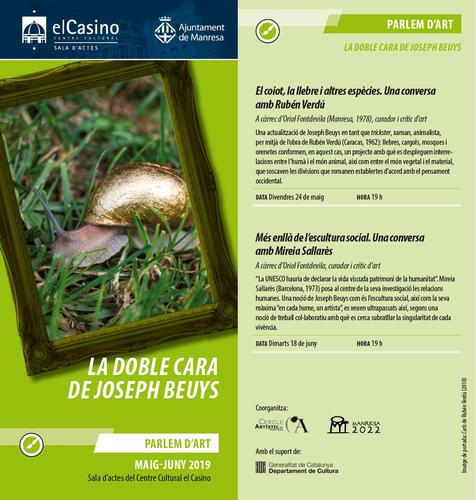 Josep Beuys (1921 – 1986) l’artista plàstic alemany, lligat a l’obra de Sant Ignasi i promotor de l’acció creativa Manresa 66, presentada a la galeria Schmela de Düsseldorf el desembre de 1966, torna a ser el punt de partida del Parlem d’Art amb dues dissertacions, a càrrec del curador i crític d’art manresà, Oriol Fontedevila, que giraran sobre l’eix temàtic “La doble cara de Joseph Beuys”.