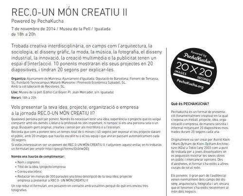 L’Ajuntament de Manresa coorganitza “REC.0- Un món creatiu II. Powered by Pechakucha”, una jornada creativa interdisciplinària que se celebrarà a Igualada el 7 de novembre, juntament amb l’Ajuntament d’Igualada, la Diputació de Barcelona, Foment de Terrassa, la Fundació Tecnocampus Mataró-Maresme, Promoció Econòmics de Sabadell i la col·laboració de Recstores SL.