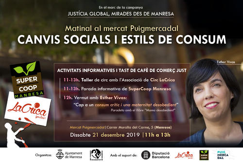 Tindrà lloc a l’Espai Degustació del Mercat Puigmercadal de les 11 del matí a la 1 del migdia i comptarà amb la participació de la cooperativa Supercoop i la Botiga de Comerç Just. La matinal inclourà una xerrada-vermut amb Esther Vivas, i a més, hi haurà un espai de circ per a infants amb LaCrica.