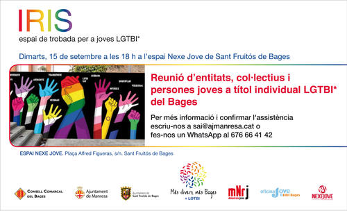 El proper dimarts 15 de setembre torna l’Espai Iris, punt de trobada de joves LGTBI+ de la comarca, organitzat des dels SAIs (Servei d’Atenció Integral) LGTBI de l’Ajuntament de Manresa i del Consell Comarcal del Bages i de l’Oficina Jove del Bages.