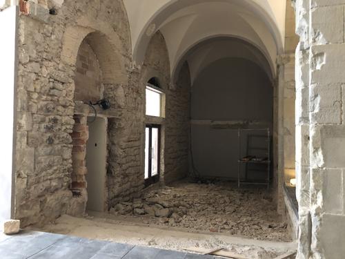 A banda, es procedirà al repicat i sanejat de les pilastres i arcs de pedra existents, amb la voluntat d’anar recuperant, successivament, els elements del claustre neoclàssic. Amb la intervenció proposada, també es pretén adequar l’espai a persones amb mobilitat reduïda, mitjançant la realització de dues rampes interiors. Una permetrà connectar l’entrada amb la cota del centre d’interpretació; l’altra, el centre d’interpretació amb l’accés al teatre. Aquest fet comportarà l’adaptació de la porta d’entrada, que es suplementarà amb llistons inferiors. Pel que fa als serveis, es farà la instal·lació elèctrica i d’enllumenat, i es condicionarà climàticament l’espai.