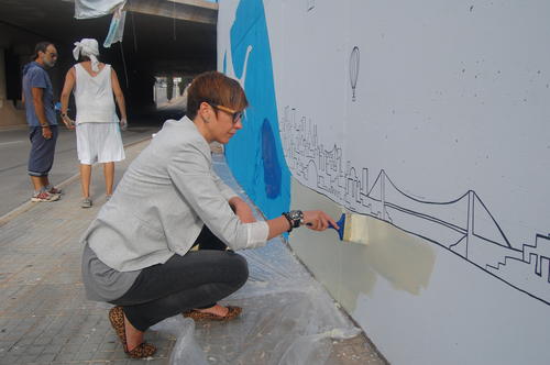La regidora de Gent gran de l’Ajuntament de Manresa, Àuria Caus, ha visitat avui al matí els artistes que pinten el mural i ha pogut comprovar el desenvolupament de l’obra. Caus, que també ha participat pintant un petit tram del mural, ha manifestat la seva satisfacció “per un projecte que permet la relació entre diferents generacions” i ha agraït “la col·laboració de moltes persones perquè aquesta obra sigui un actiu per a la ciutat”.
