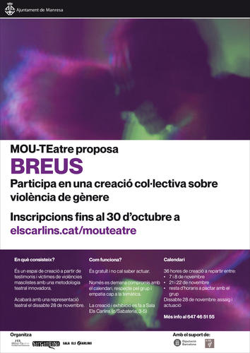 La Sala Els Carlins, la companyia Sargantana i l’Ajuntament de Manresa, amb el suport de la Diputació de Barcelona, promouen una nova edició del projecte ‘MOU-TEatre. Arts escèniques, inclusió i transformació social’, una iniciativa que promou la reflexió col·lectiva a través de les arts escèniques amb l’objectiu de compartir inquietuds al voltant de temàtiques que ens interpel·len com a societat. En aquesta ocasió, la proposta convida a participar en un procés de creació col·lectiva que explora el perquè de la violència de gènere i el seu impacte social i personal.