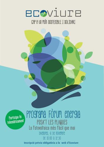 Malgrat l’ajornament de la fira Ecoviure en modalitat presencial, aquest divendres se celebrarà el Fòrum Energia, la jornada professional que cada any es dedica a les energies renovables i que ja s’ha convertit en un referent per als professionals del sector. A causa de la situació de pandèmia, el Fòrum es farà totalment en línia però mantenint el programa que s’havia plantejat inicialment, amb la participació d’experts, administracions, empreses i professionals que exposaran diferents experiències al voltant de l’energia solar fotovoltaica. Les inscripcions per participar al Fòrum són obertes i poden fer-se al web www.ecoviure.cat. L’horari de la jornada serà de 10 del matí a 12.30 del migdia.